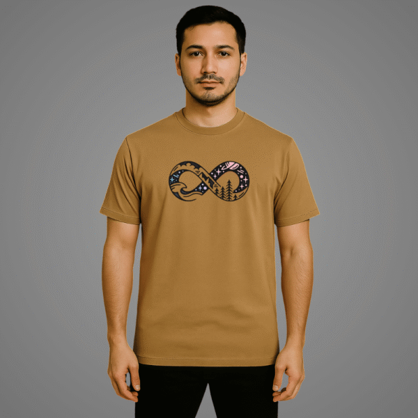 • Front Design: A creative infinity symbol graphic is shown, filled with a nature-themed motif including mountains, trees, stars, and a wave.